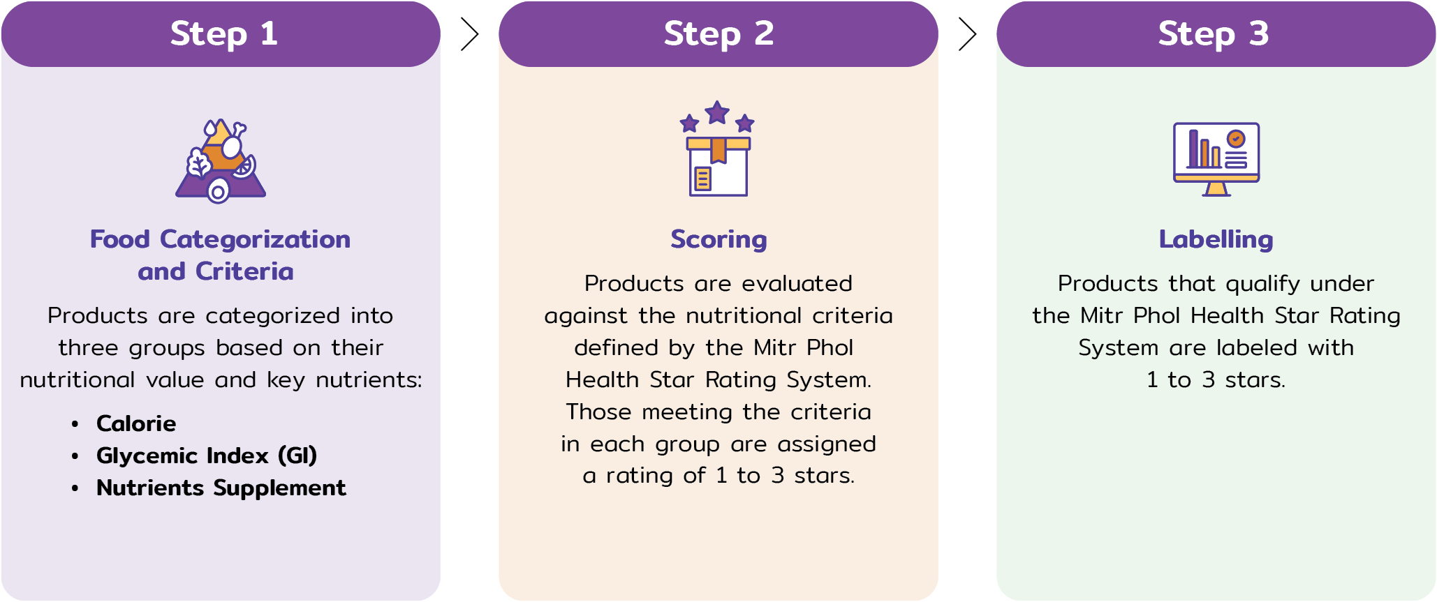 Mitr Phol provides product information to support and promote consumer health and nutrition, while improving and developing new products that encourage healthy eating and address diverse consumer needs. The Company has developed processes and established health and nutrition guidelines known as the “Mitr Phol Health Star Rating” System. This system applies nutritional quality criteria based on announcements from the Food and Drug Administration (FDA), relevant laws, and international nutrition standards to define key indicators used in evaluating the nutritional profile of products, ensuring consistency and appropriateness for the Company’s business. The evaluation is conducted through a Nutrition Profiling System with the following steps;