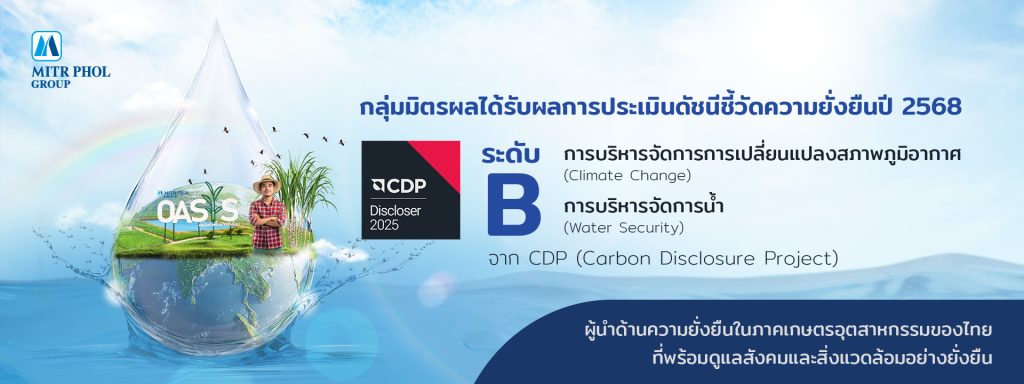 กลุ่มมิตรผลได้รับผลการประเมินดัชนีชี้วัดความยั่งยืน ในระดับ B ด้านการบริหารจัดการการเปลี่ยนแปลงสภาพภูมิอากาศ (Climate Change) และ ด้านการบริหารจัดการน้ำ (Water Security) จาก CDP (Carbon Disclosure Project) ประจำปี 2568 ตอกย้ำการเป็นผู้นำด้านความยั่งยืนในภาคเกษตรอุตสาหกรรมของไทย ที่พร้อมดูแลสังคมและสิ่งแวดล้อมอย่างยั่งยืน