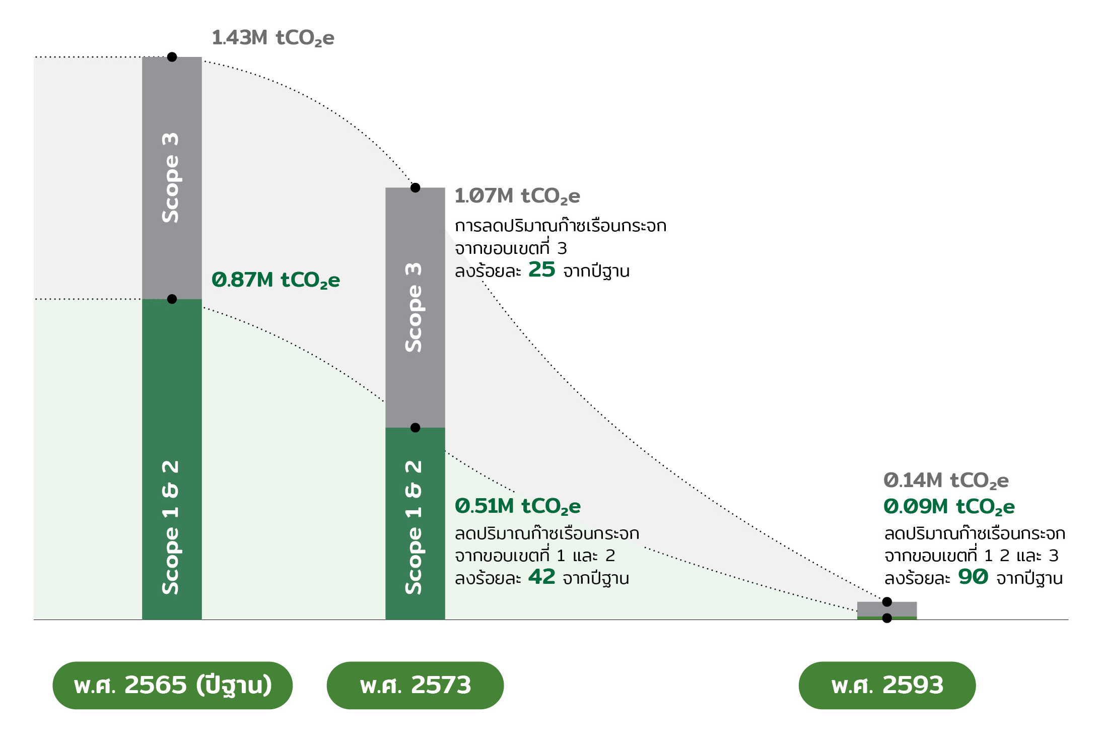 • ลดปริมาณก๊าซเรือนกระจกจากขอบเขตที่ 1 2 และ 3 ลงร้อยละ 90 จากปีฐาน