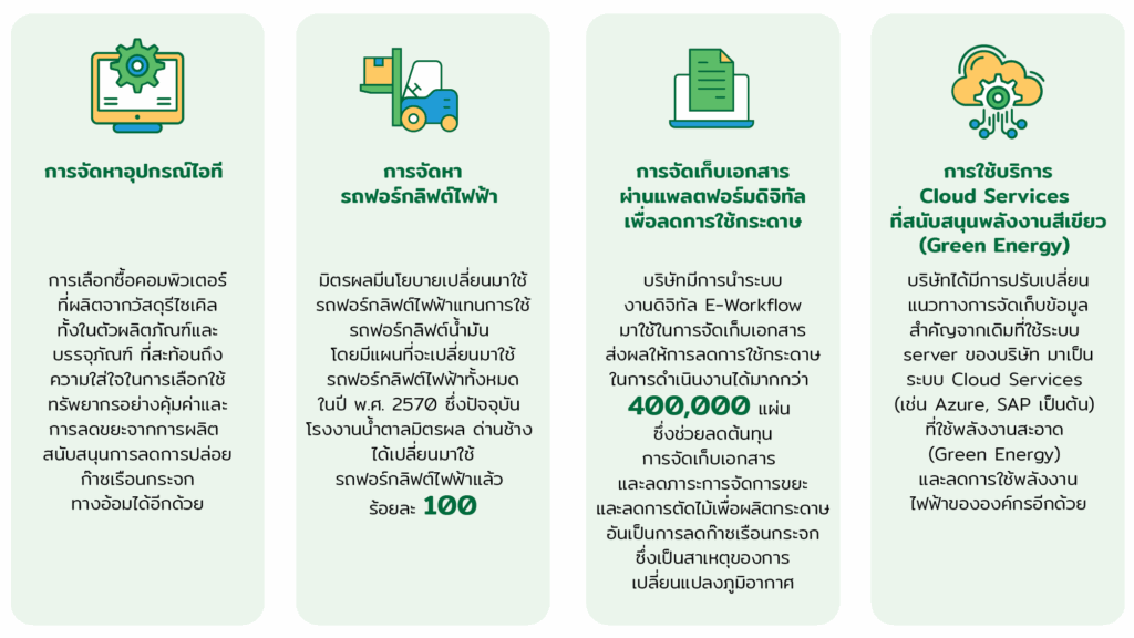 มิตรผลสนับสนุนการใช้เทคโนโลยีดิจิทัลเพื่อสนับสนุนการดำเนินงานขององค์กรมาอย่างต่อเนื่อง โดยปี พ.ศ.2567 ได้มีการนำเทคโนโลยีมาใช้ในการจัดซื้อจัดจ้างและการดำเนินงานที่เป็นมิตรต่อสิ่งแวดล้อม (Green Sourcing and Green Operation) เพื่อสนับสนุนการลดการปล่อยก๊าซเรือนกระจกและเพิ่มประสิทธิภาพการใช้ทรัพยากรอย่างคุ้มค่าและเกิดประโยชน์สูงสุด ด้วยความมุ่งหวังในการสร้างสมดุลระหว่างการเติบโตทางธุรกิจและความรับผิดชอบต่อสิ่งแวดล้อมและสังคม โดยการใช้เทคโนโลยีเพื่อการดำเนินงานดังกล่าวมีรายละเอียดดังต่อไปนี้