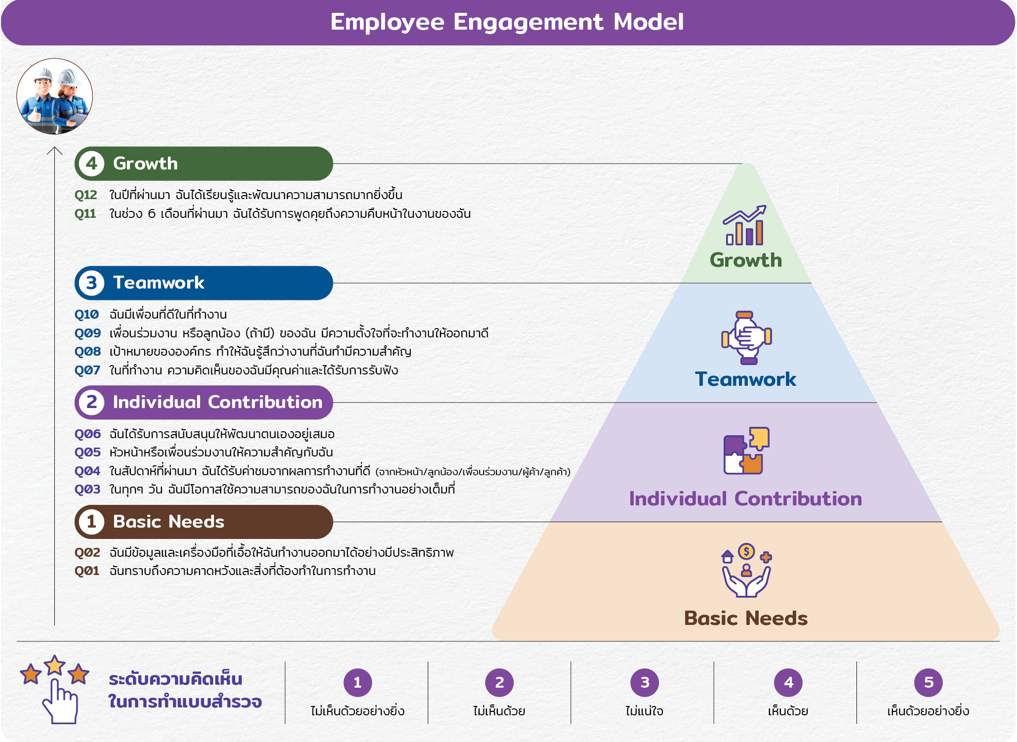 4. ความก้าวหน้าในหน้าที่การงาน (Career Growth)  คือ พนักงานได้รับการ Feedback และคำแนะนำเพื่อช่วยในการปรับปรุงและพัฒนางานให้ดียิ่งขึ้น รวมถึงมีโอกาสในการเรียนรู้และพัฒนาความสามารถในการทำงาน