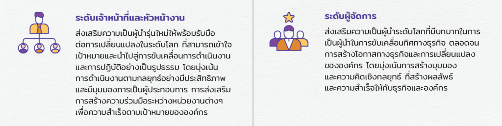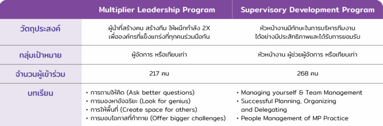 เป็นโครงการที่มุ่งพัฒนาทักษะความเป็นผู้นำตามบทบาทในแต่ละระดับ เพื่อให้มีความรู้ความสามารถที่เหมาะสมและได้รับการยอมรับจากผู้ใต้บังคับบัญชาและทีมงานที่ใกล้ชิด ซึ่งจะนำไปสู่การบริหารทรัพยากรและยกระดับการบริหารงานในหน่วยงานให้เกิดประสิทธิภาพสูงสุด โดยโครงการประกอบด้วย 2 หลักสูตร ได้แก่ Multiplier Leadership Program และ Supervisory Development Program